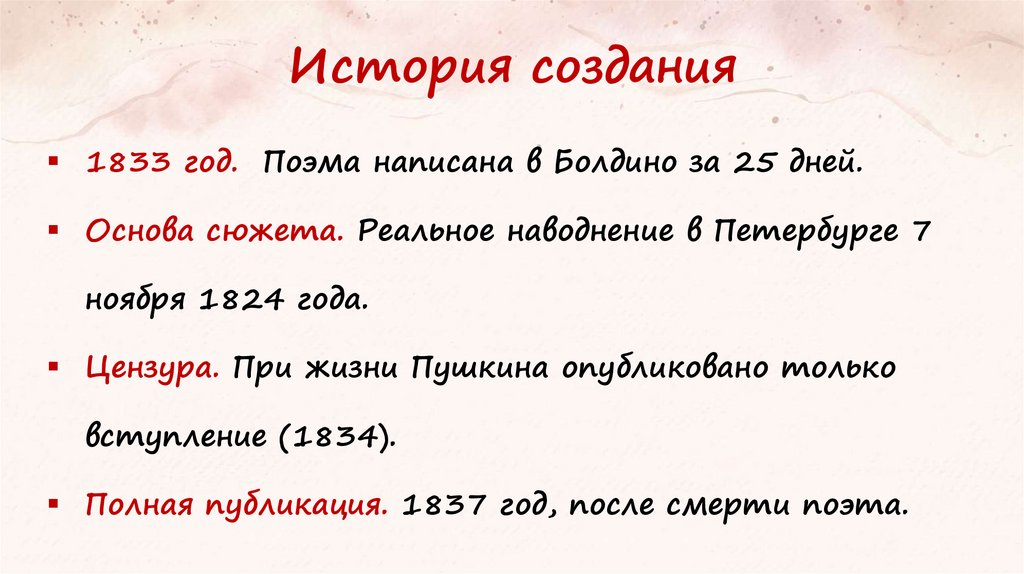 История создания1833 год. Поэма написана в Болдино за 25 дней.