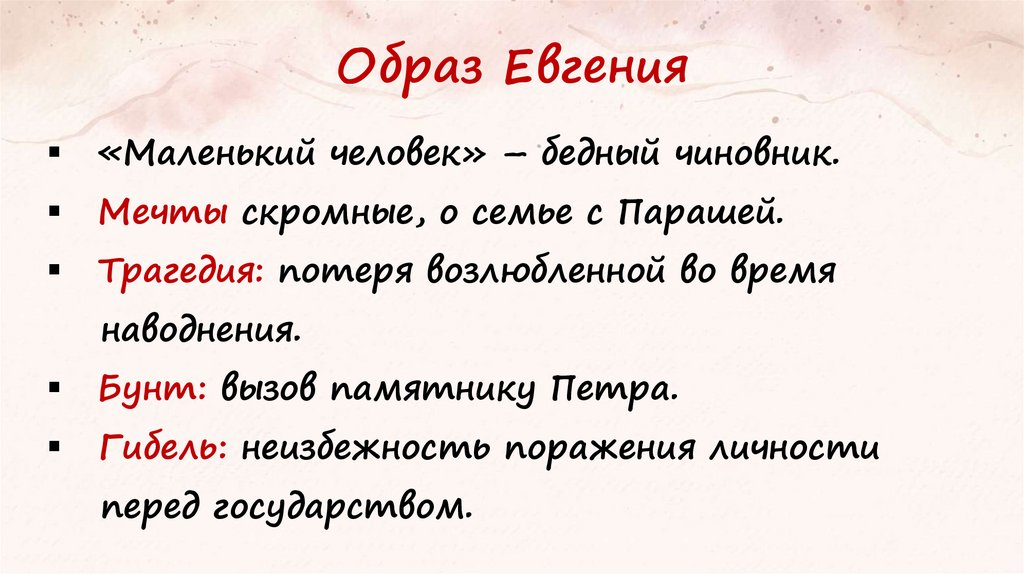 Образ Евгения«Маленький человек» – бедный чиновник.