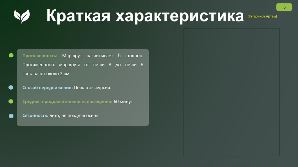 Краткая характеристикаПротяженность: Маршрут насчитывает 5 стоянок.