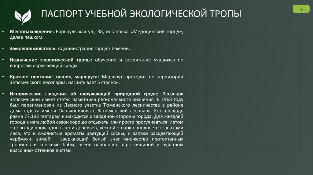 ПАСПОРТ УЧЕБНОЙ ЭКОЛОГИЧЕСКОЙ ТРОПЫМестонахождение: Барнаульская ул., 38, остановка «Медицинский город»,