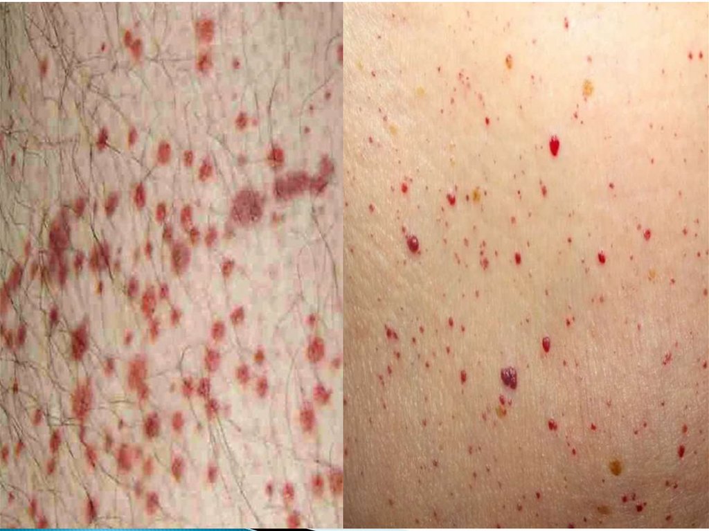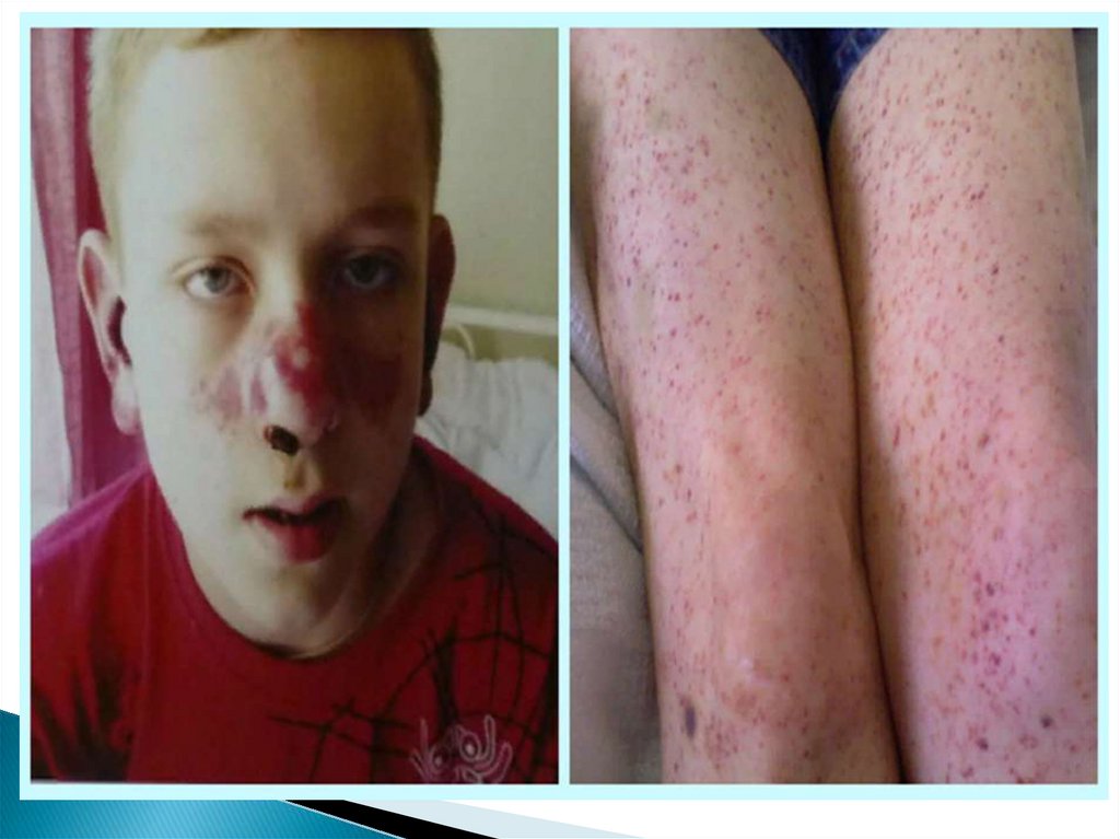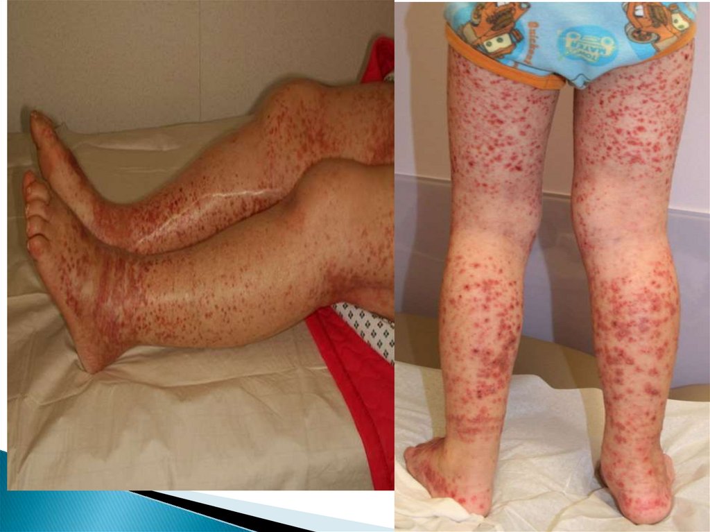 кровоизлияиния в виде экхимозов на конечностях, туловище.