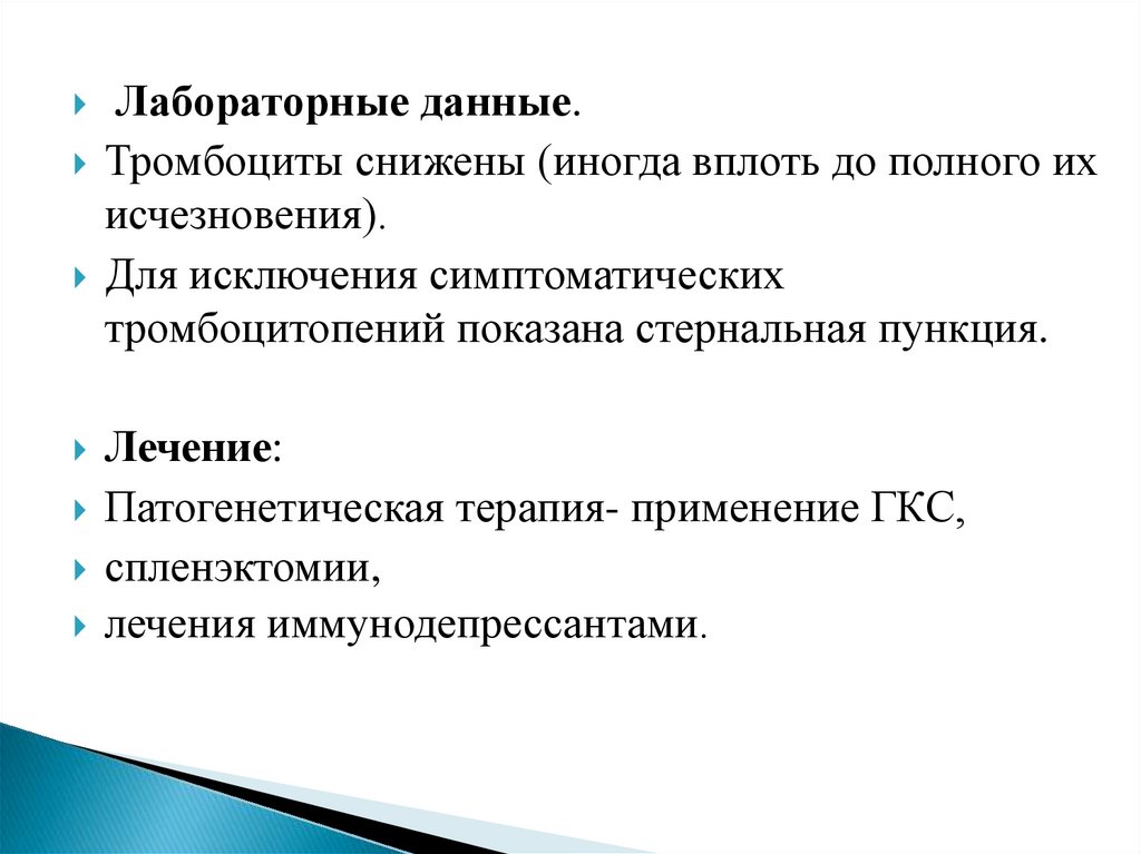 Лабораторные данные.Тромбоциты снижены (иногда вплоть до полного их