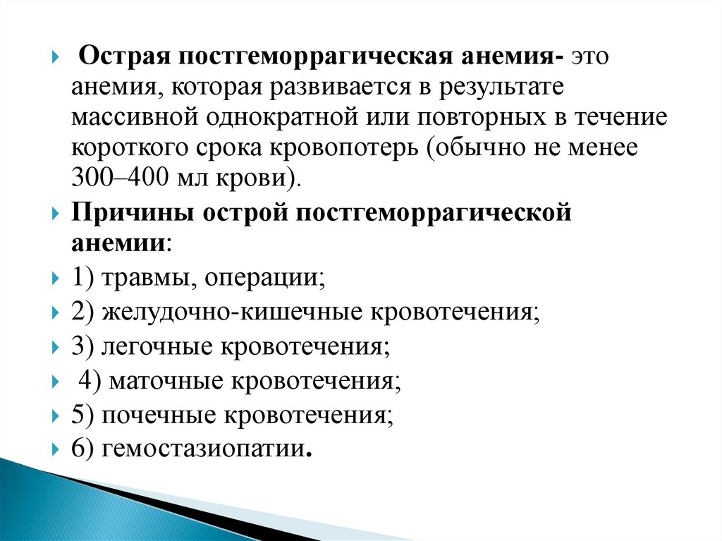 постгеморрагические анемии: 1) острые; 2) хронические.