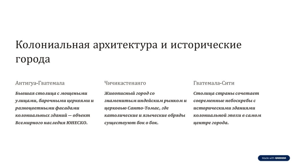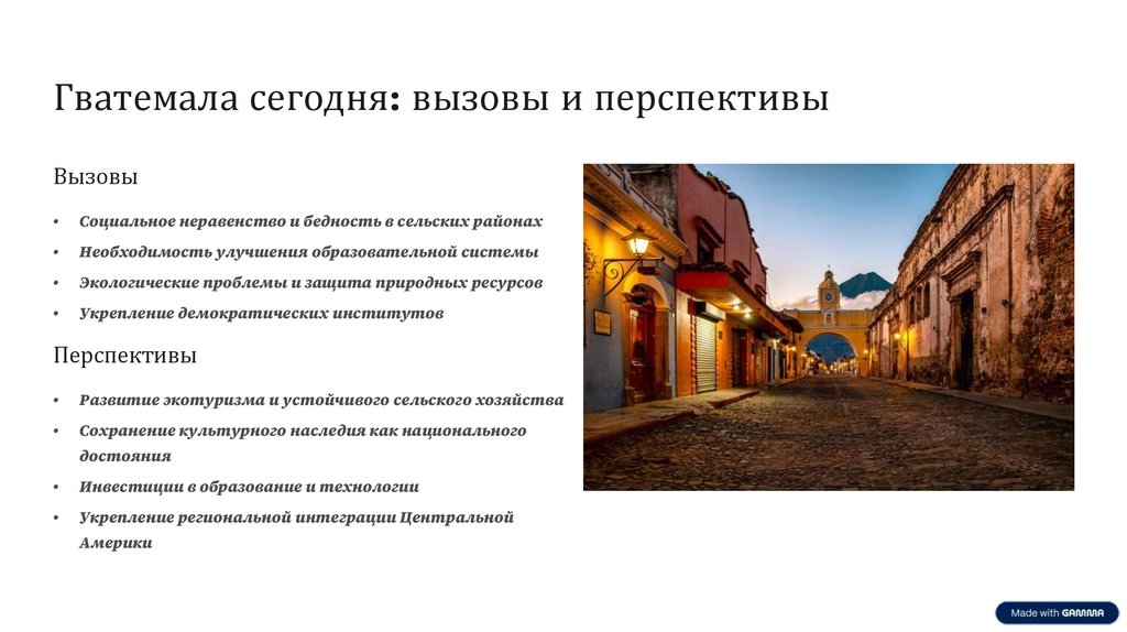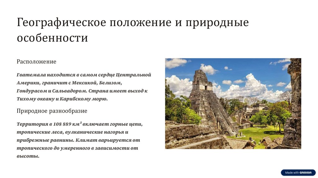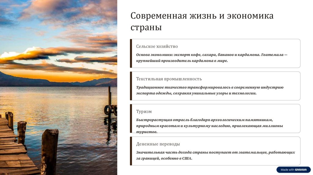 Основа экономики: экспорт кофе, сахара, бананов и кардамона. Гватемала —