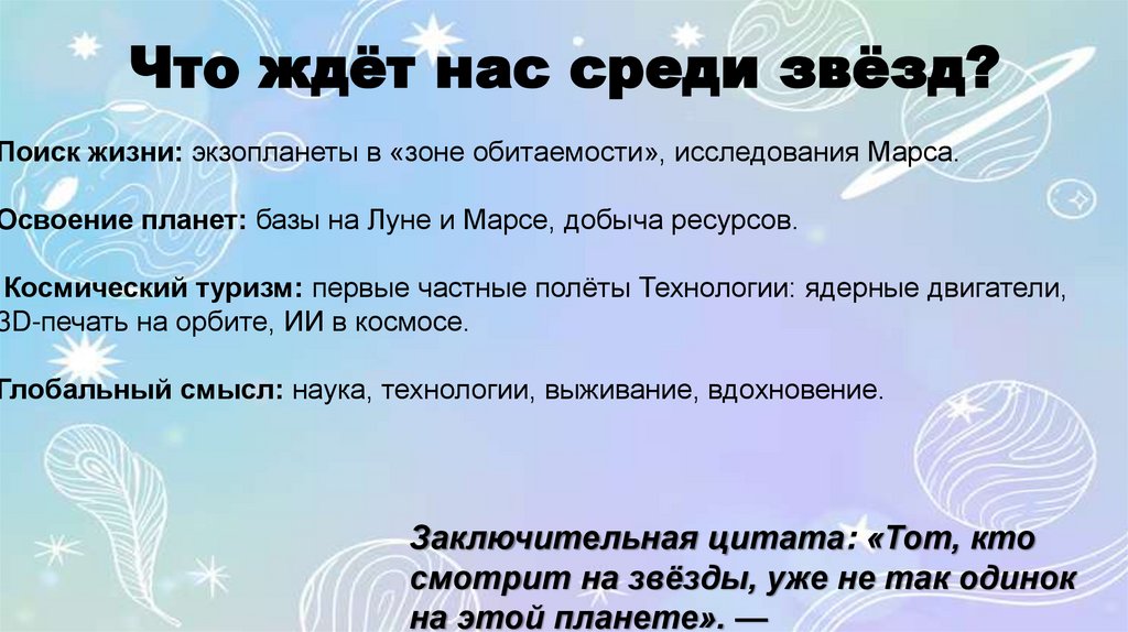 Что ждёт нас среди звёзд?Поиск жизни: экзопланеты в «зоне обитаемости», исследования Марса.