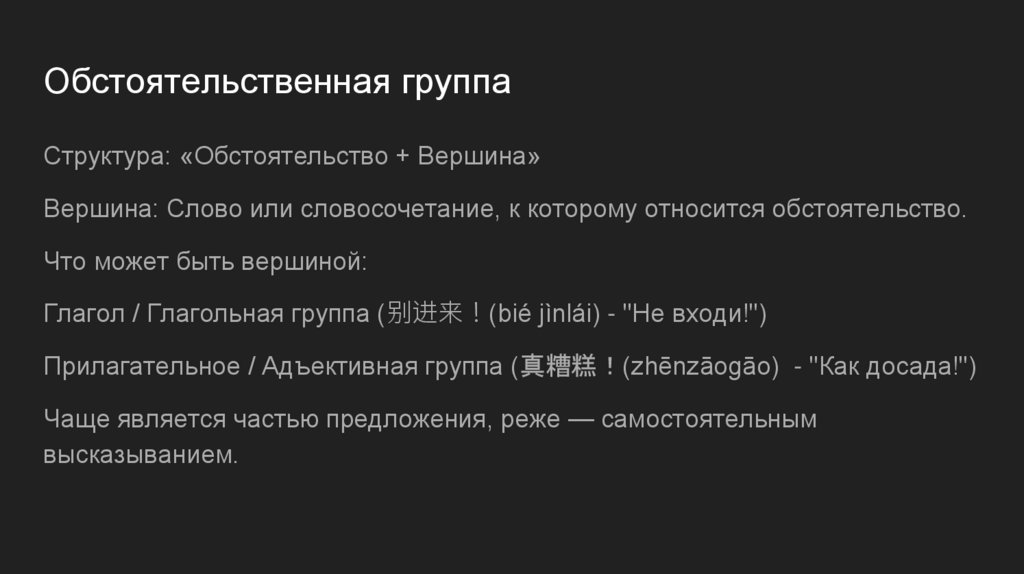 Обстоятельственная группаСтруктура: «Обстоятельство + Вершина»