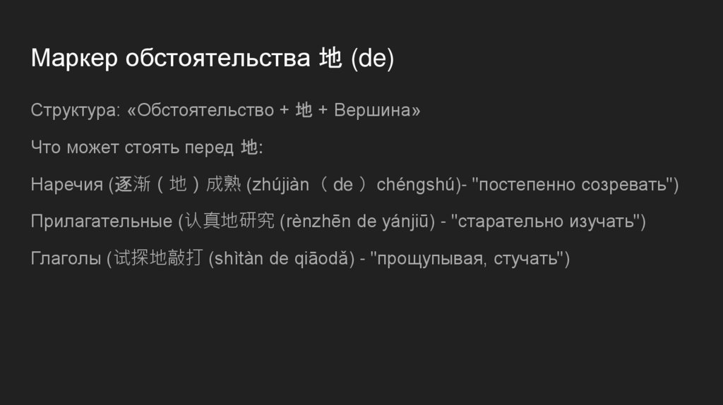 Маркер обстоятельства 地 (de)Структура: «Обстоятельство + 地 + Вершина»