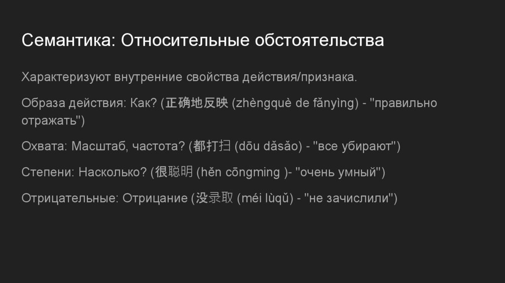 Семантика: Относительные обстоятельстваХарактеризуют внутренние свойства действия/признака.