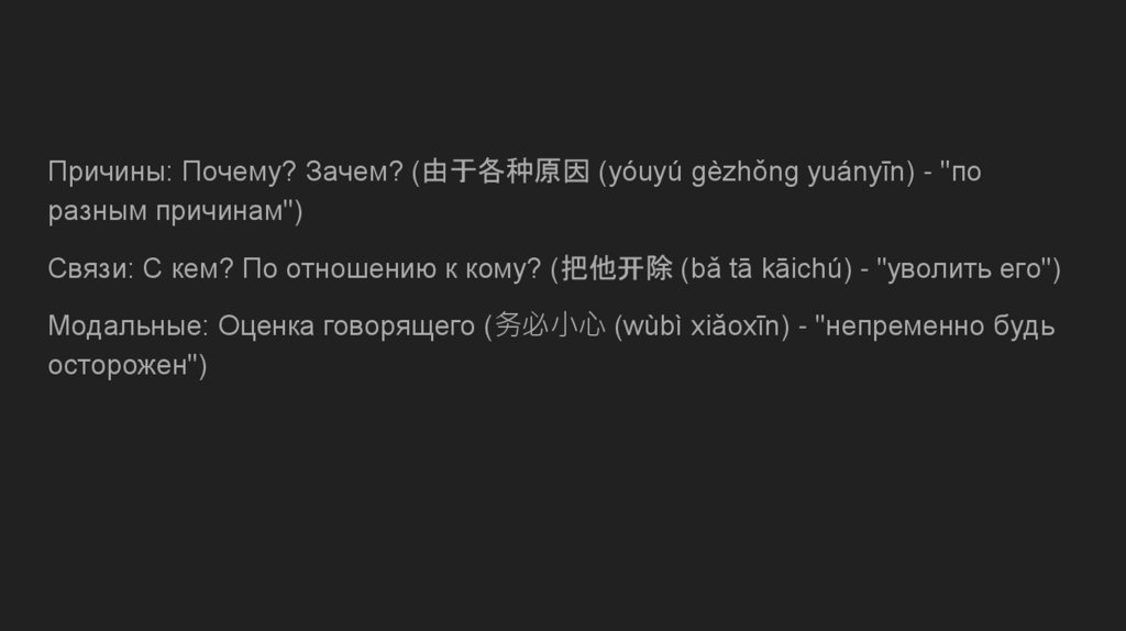 Причины: Почему? Зачем? (由于各种原因 (yóuyú gèzhǒng yuányīn) - "поразным причинам")