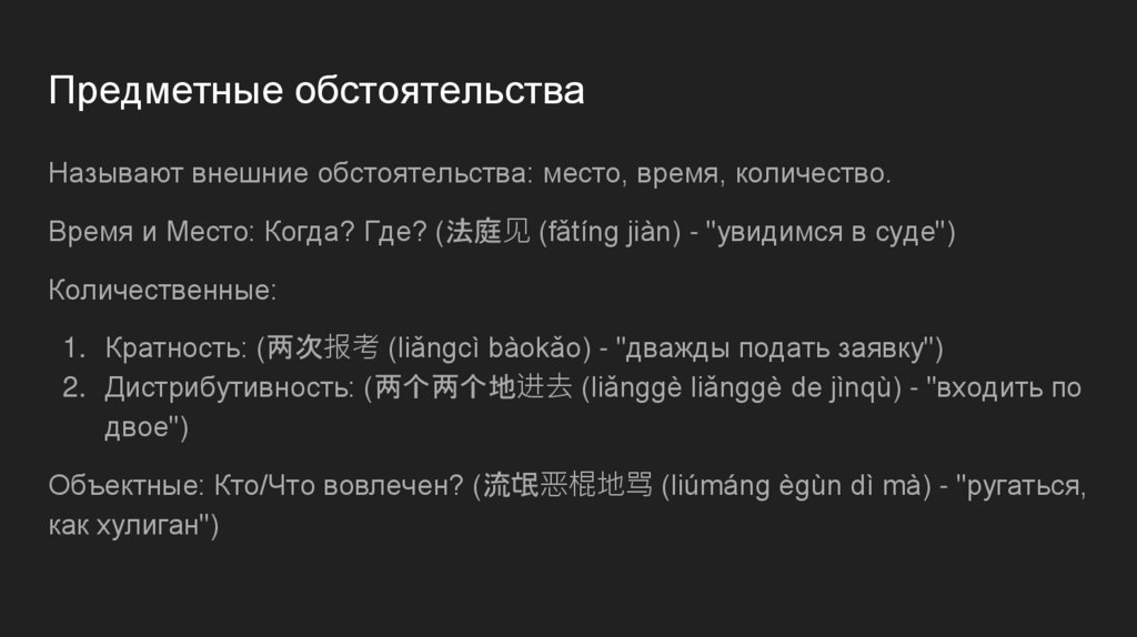Предметные обстоятельстваНазывают внешние обстоятельства: место, время, количество.