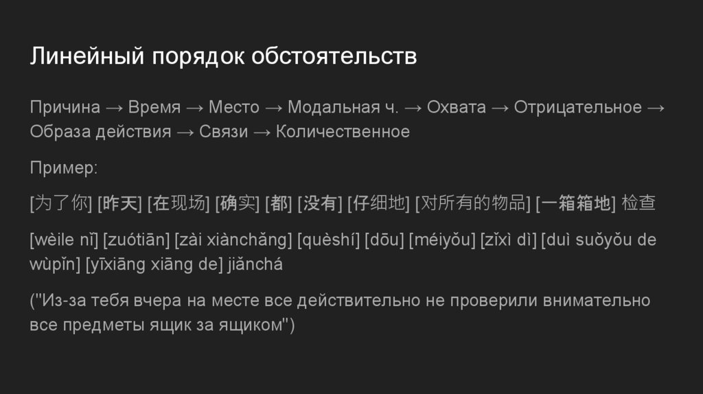 Линейный порядок обстоятельствПричина → Время → Место → Модальная ч. → Охвата → Отрицательное →