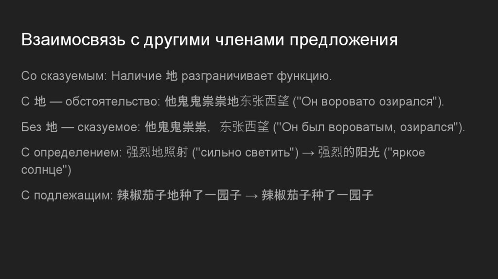 Взаимосвязь с другими членами предложенияСо сказуемым: Наличие 地 разграничивает функцию.