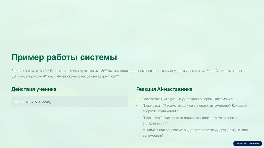 Пример работы системыЗадача: "Из пунктов A и B, расстояние между которыми 300 км, выехали одновременно навстречу друг другу два автомобиля. Скорость первого —