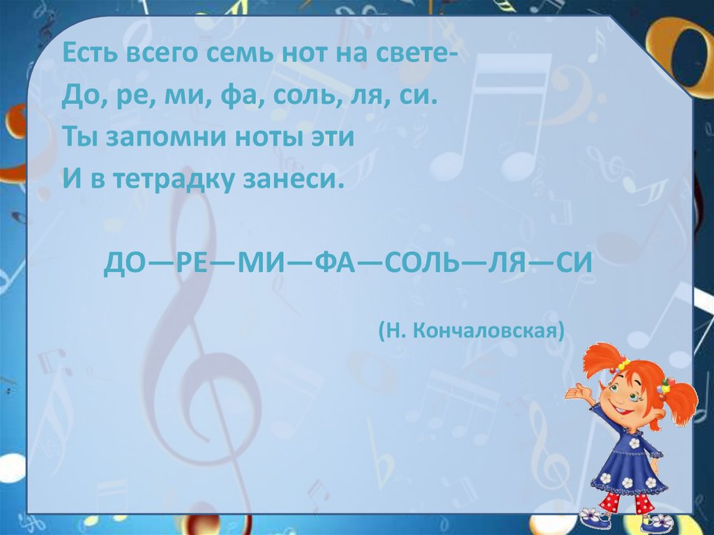 Есть всего семь нот на светеДо, ре, ми, фа, соль, ля, си.Ты запомни ноты эти