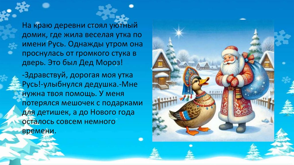 На краю деревни стоял уютныйдомик, где жила веселая утка по