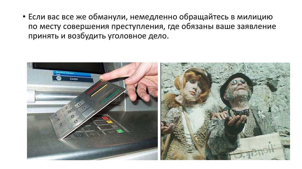 • Если вас все же обманули, немедленно обращайтесь в милициюпо месту совершения преступления, где обязаны ваше заявление