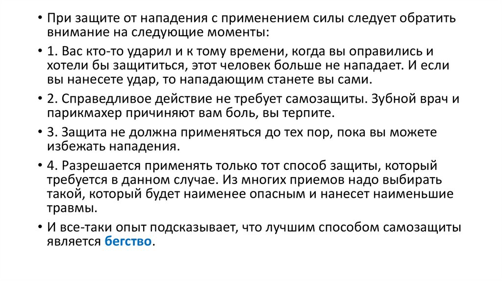 • При защите от нападения с применением силы следует обратитьвнимание на следующие моменты: