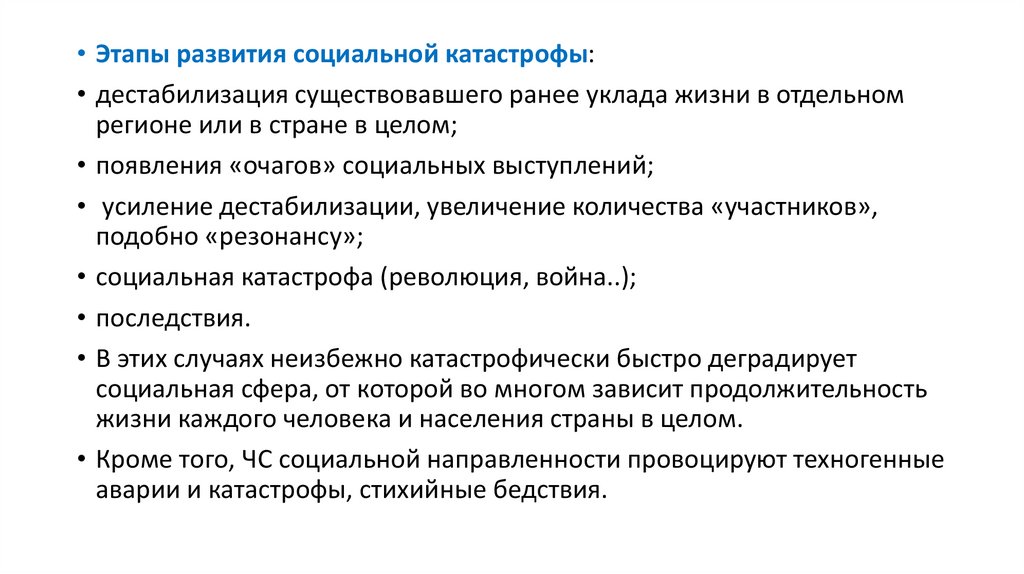 • Этапы развития социальной катастрофы:• дестабилизация существовавшего ранее уклада жизни в отдельном