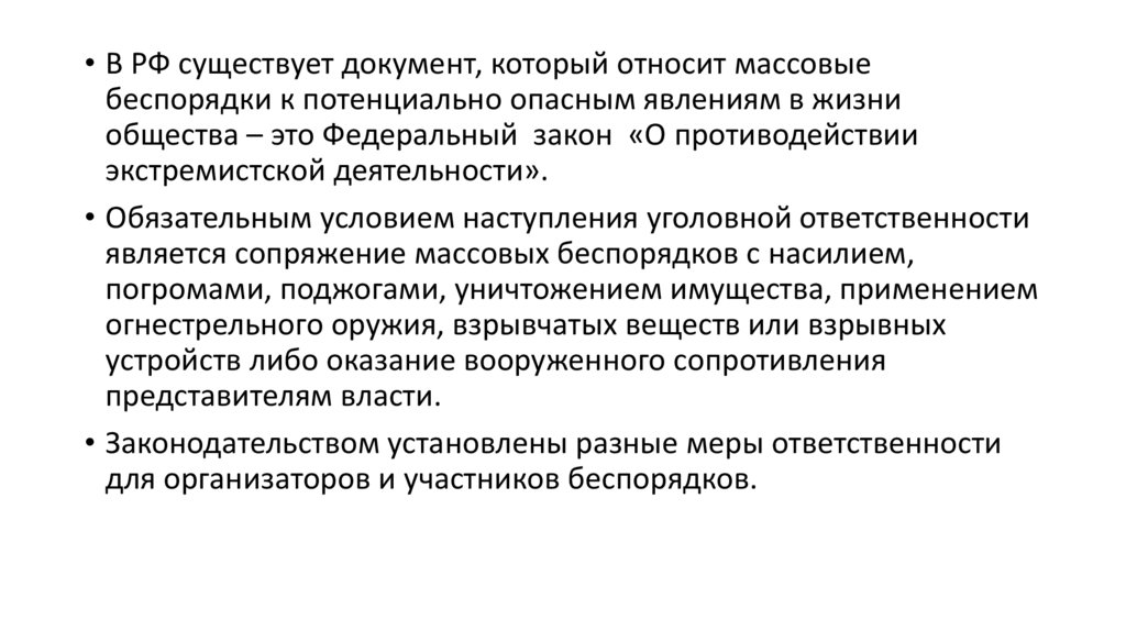 • В РФ существует документ, который относит массовыебеспорядки к потенциально опасным явлениям в жизни