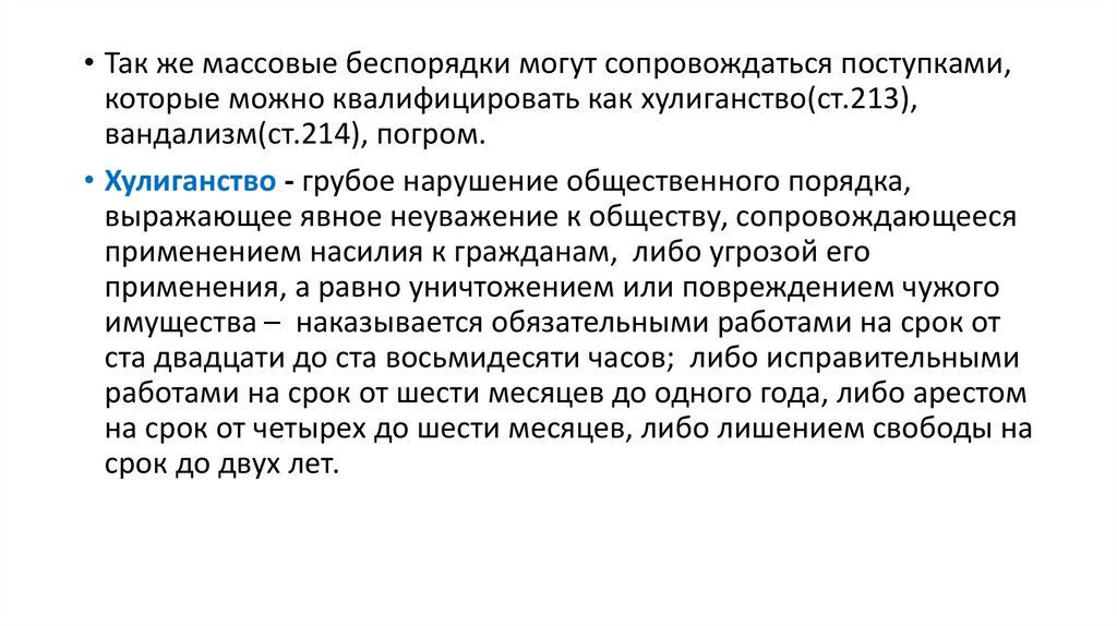 • Так же массовые беспорядки могут сопровождаться поступками,которые можно квалифицировать как хулиганство(ст.213),