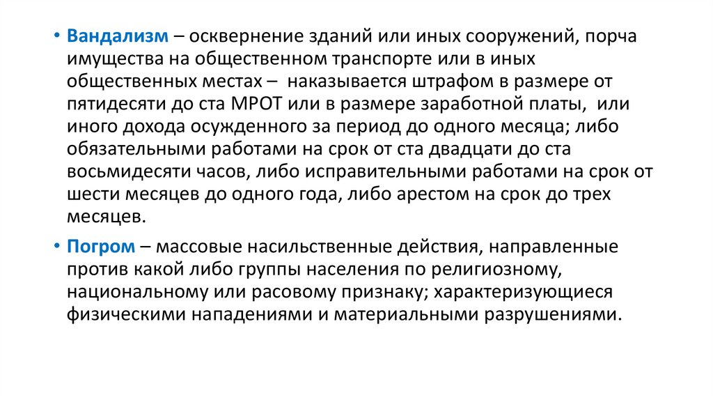 • Вандализм – осквернение зданий или иных сооружений, порчаимущества на общественном транспорте или в иных