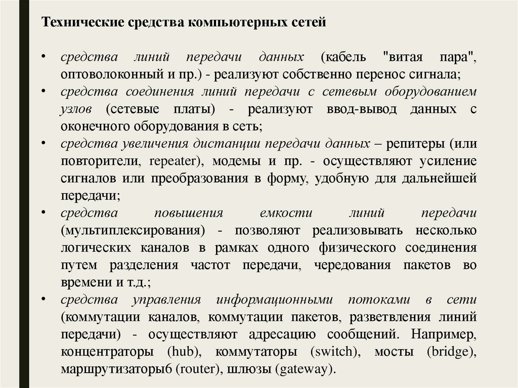 Технические средства компьютерных сетей• средства линий передачи данных (кабель "витая пара",