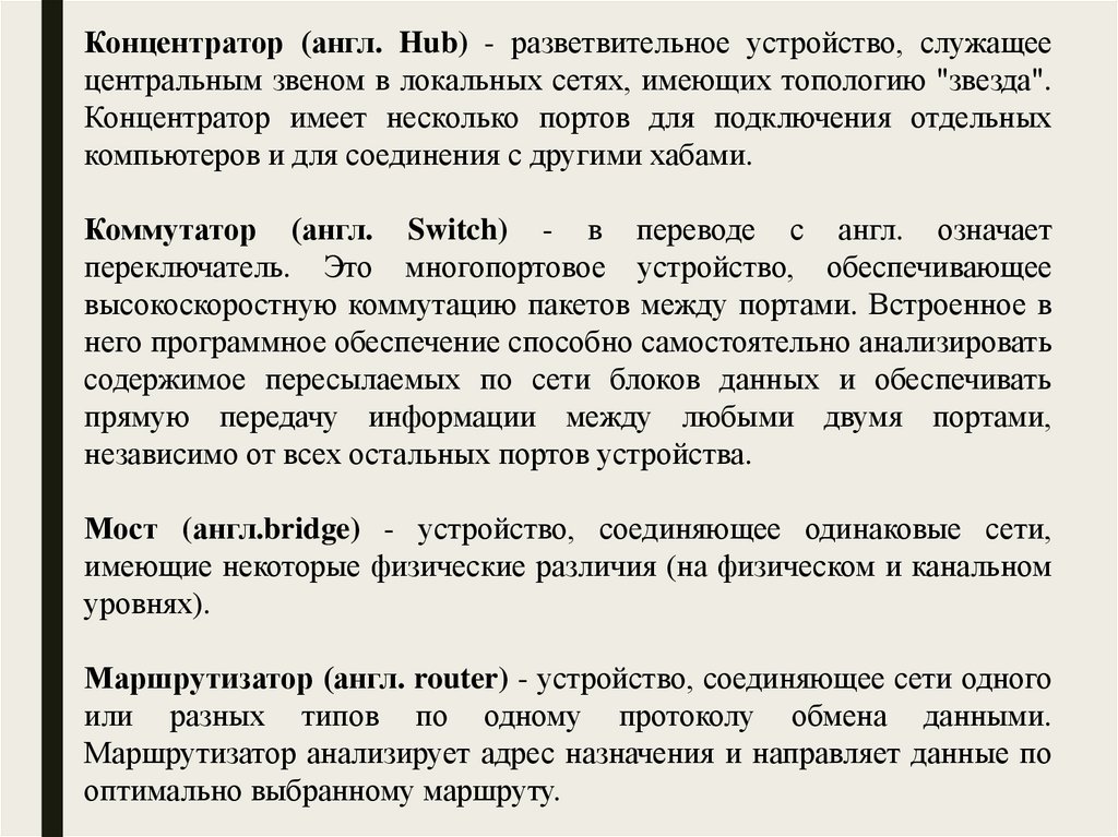 концентраторы (hub), коммутаторы (switch), мосты (bridge),