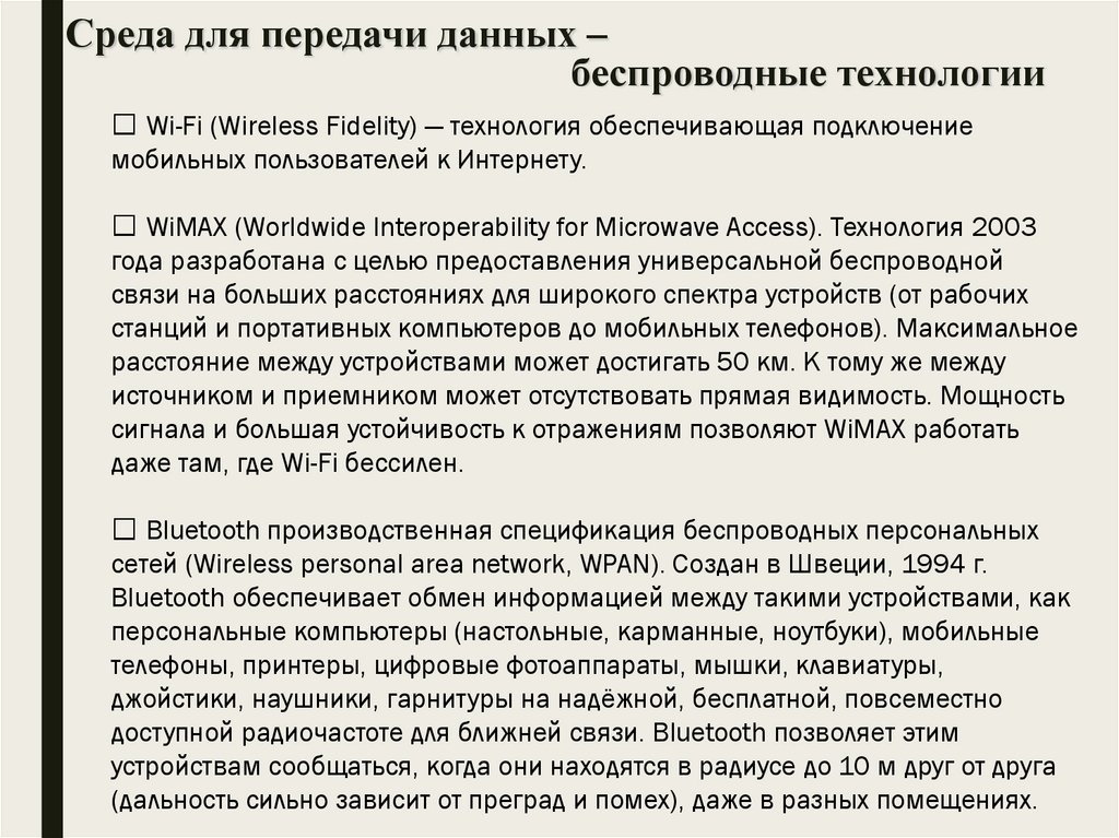Среда для передачи данных –беспроводные технологии