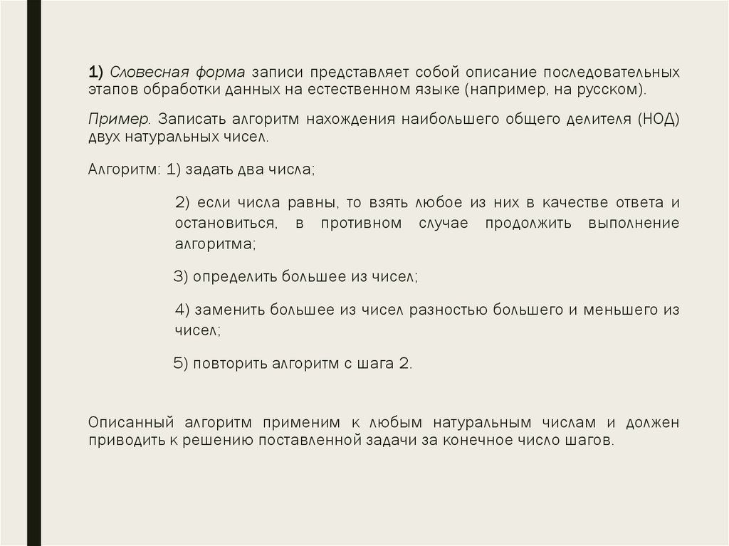 ■ Пример. 1) задать два числа x и y; 2) ЕСЛИ x=y, ТО НОД=x и
