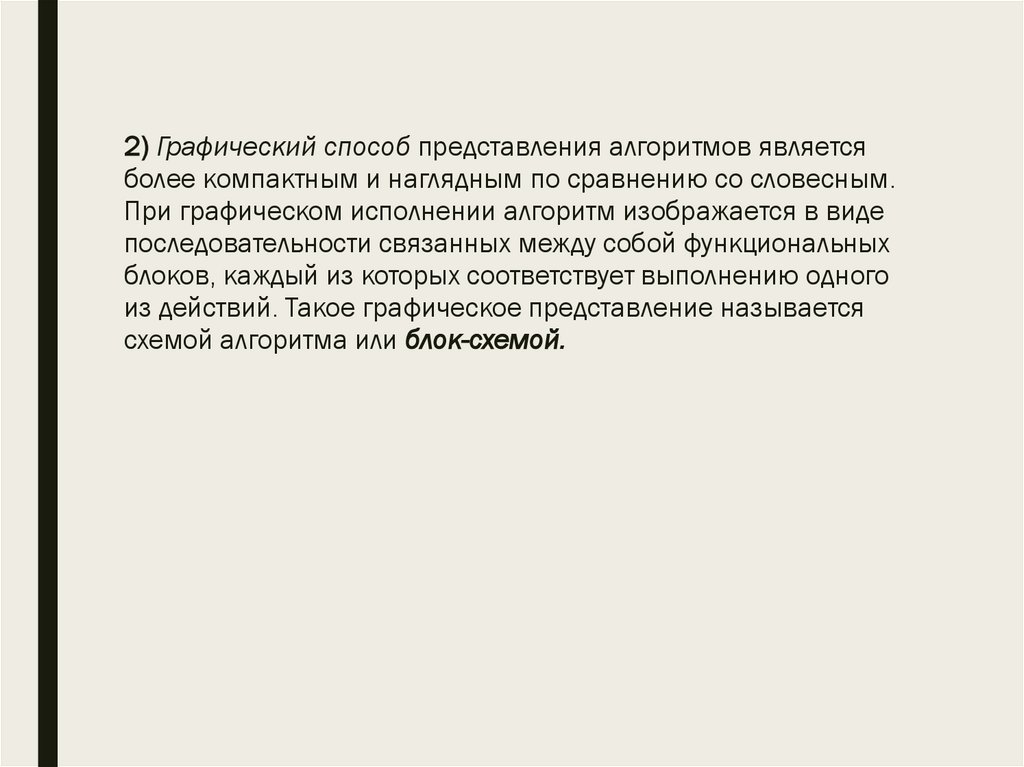 2) Графический способ представления алгоритмов являетсяболее компактным и наглядным по сравнению со словесным.