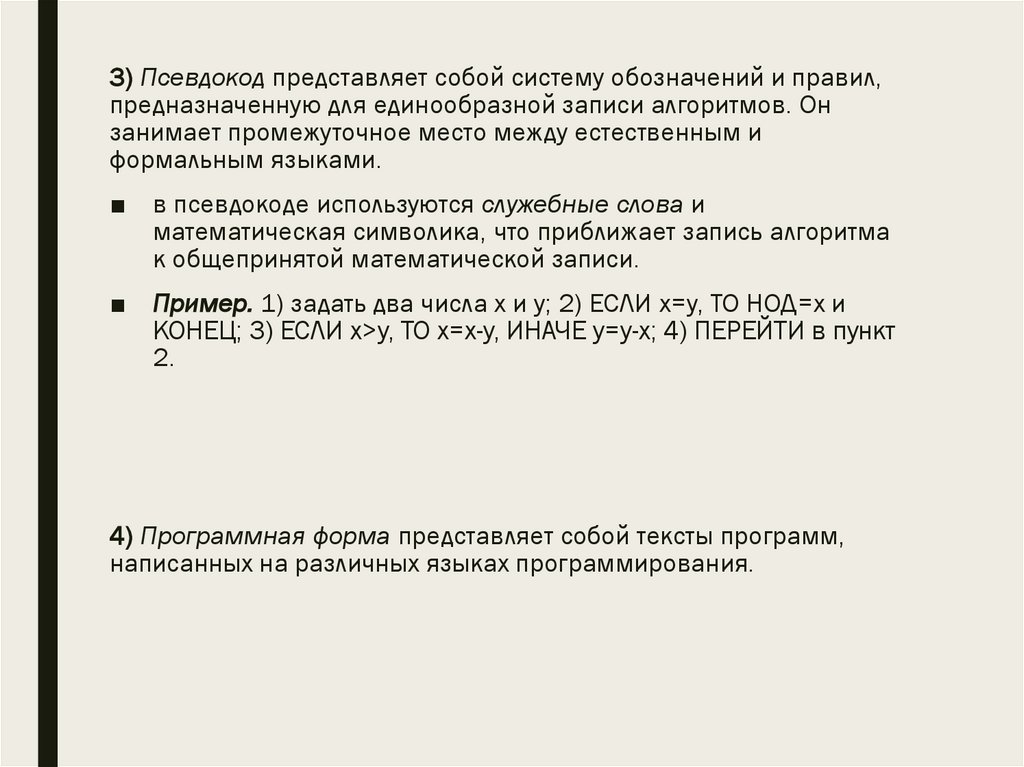 3) Псевдокод представляет собой систему обозначений и правил,предназначенную для единообразной записи алгоритмов. Он