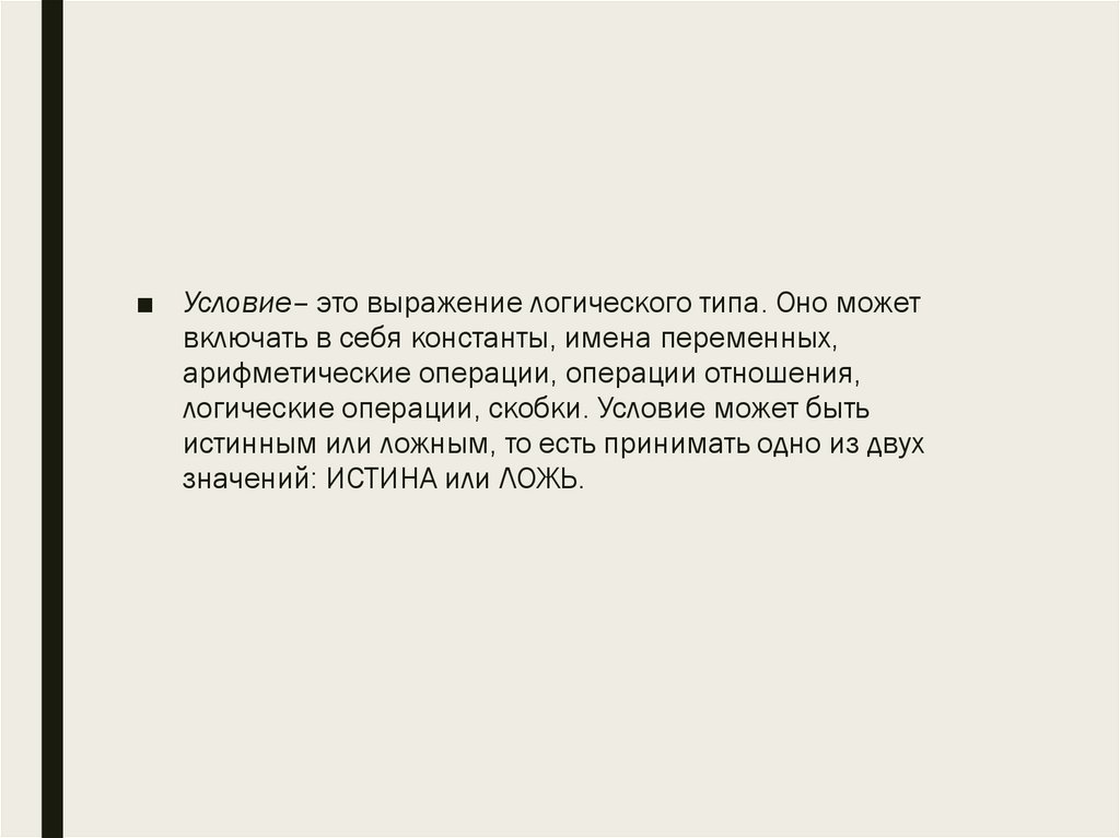 ■ Условие– это выражение логического типа. Оно можетвключать в себя константы, имена переменных,