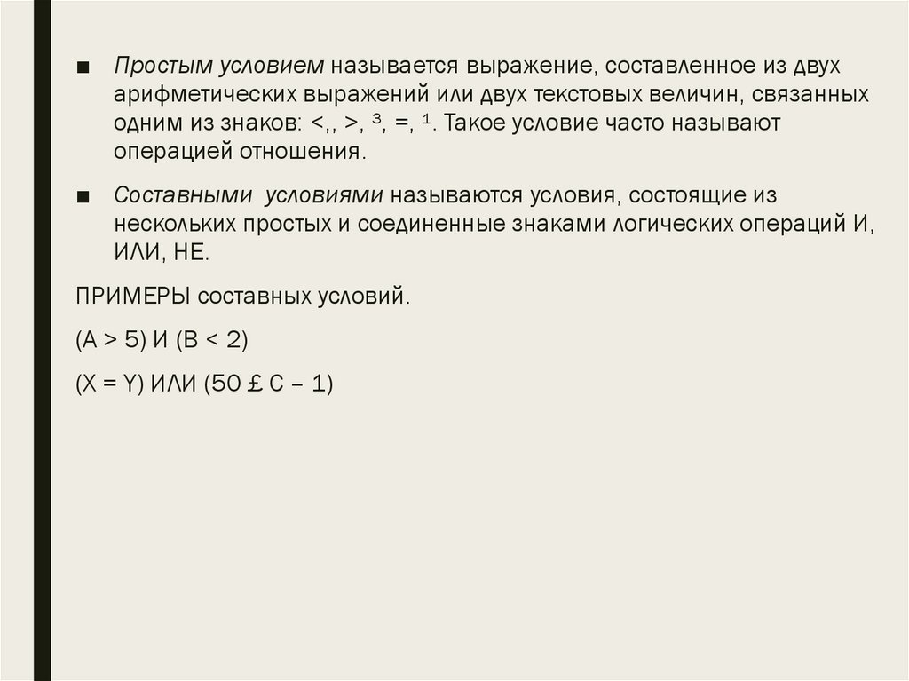 ■ Простым условием называется выражение, составленное из двухарифметических выражений или двух текстовых величин, связанных