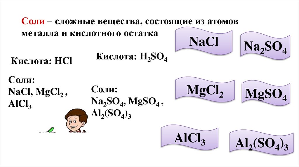 Соли – сложные вещества, состоящие из атомовметалла и кислотного остатка