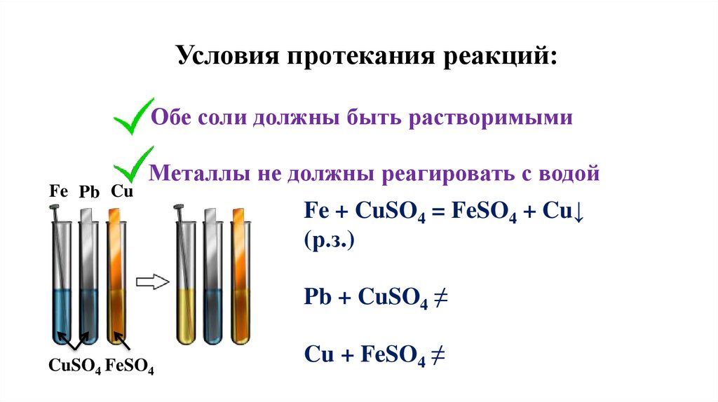 Условия протекания реакций:Обе соли должны быть растворимыми