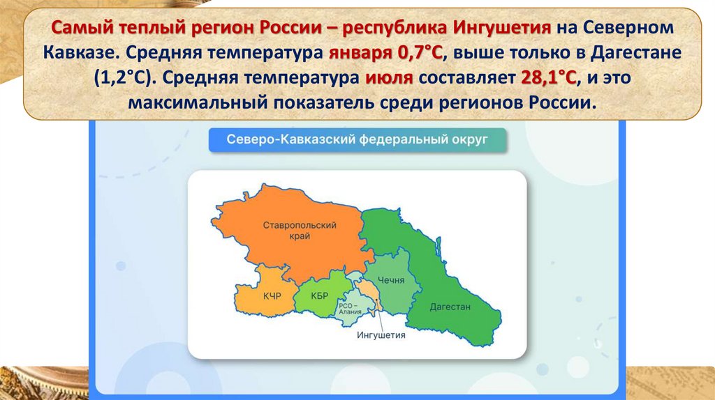 Самый теплый регион России – республика Ингушетия на СеверномКавказе. Средняя температура января 0,7°С, выше только в Дагестане