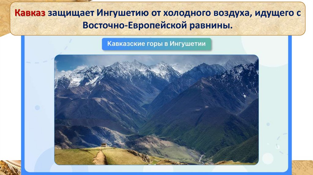 Кавказ защищает Ингушетию от холодного воздуха, идущего сВосточно-Европейской равнины.