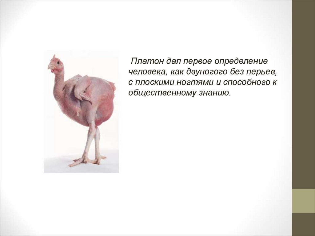 Платон дал первое определениечеловека, как двуногого без перьев,