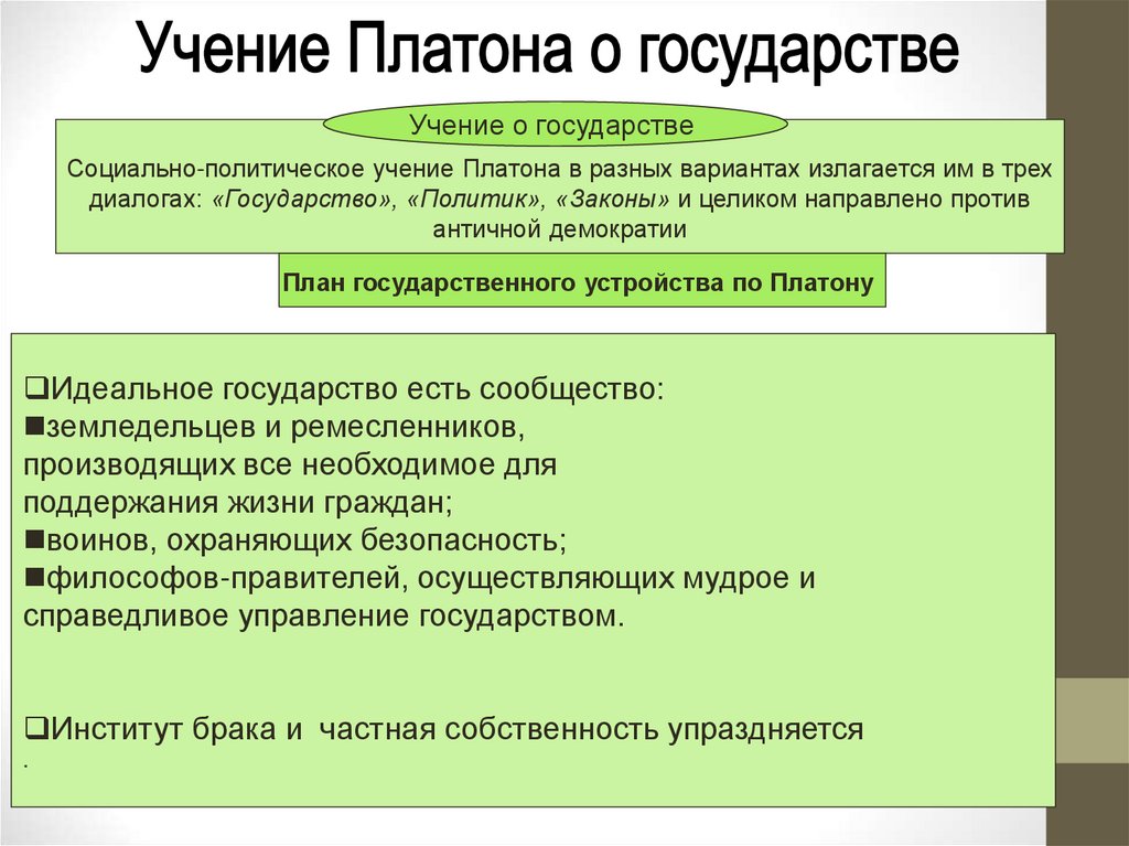 Учение о государствеСоциально-политическое учение Платона в разных вариантах излагается им в трех
