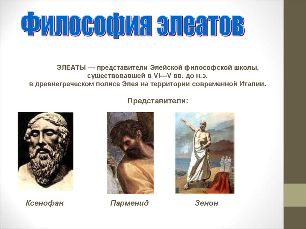 ЭЛЕАТЫ — представители Элейской философской школы,существовавшей в VI—V вв. до н.э.
