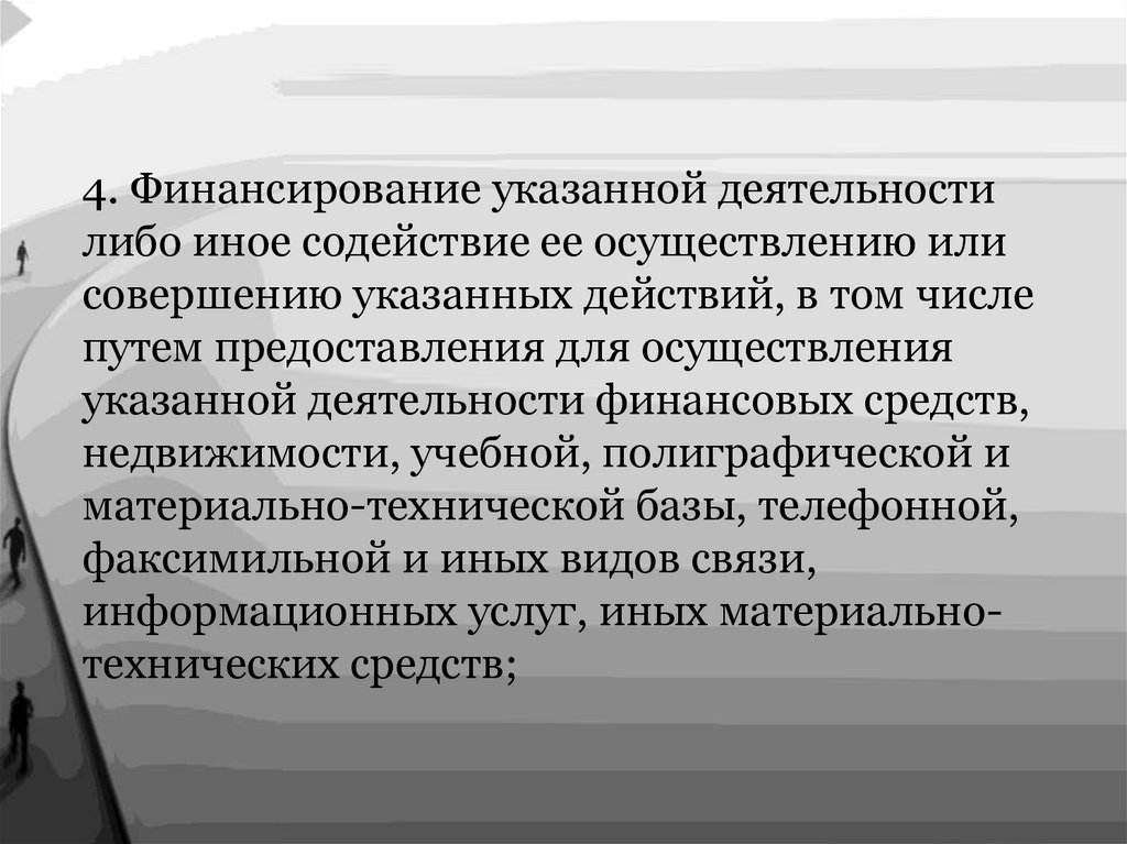 4. Финансирование указанной деятельностилибо иное содействие ее осуществлению или
