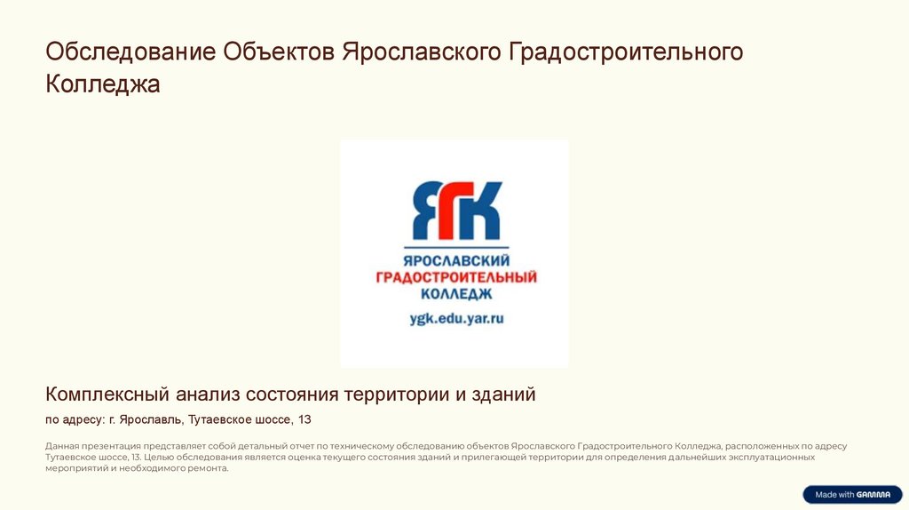 Данная презентация представляет собой детальный отчет по техническому обследованию объектов Ярославского Градостроительного Колледжа, расположенных по адресу