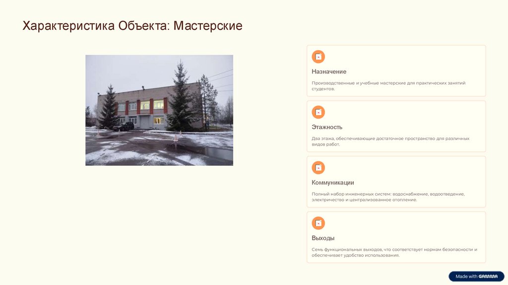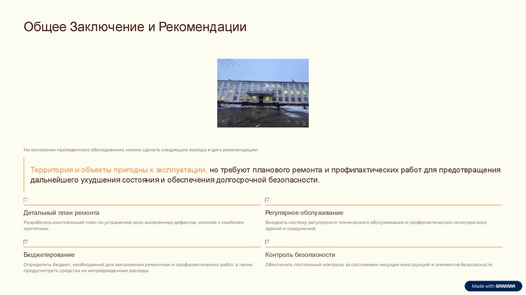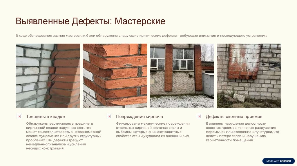Выявленные Дефекты: МастерскиеВ ходе обследования здания мастерских были обнаружены следующие критические дефекты, требующие внимания и последующего устранения: