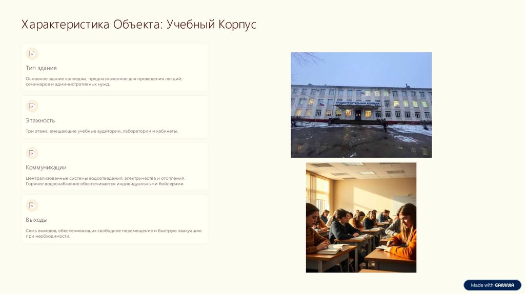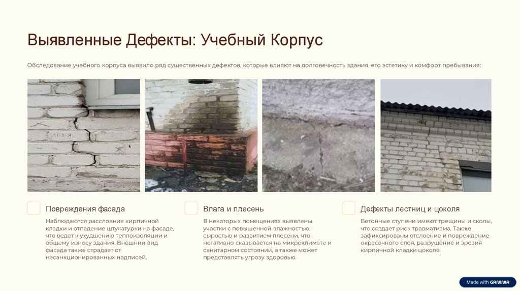 Выявленные Дефекты: Учебный КорпусОбследование учебного корпуса выявило ряд существенных дефектов, которые влияют на долговечность здания, его эстетику и комфорт пребывания: