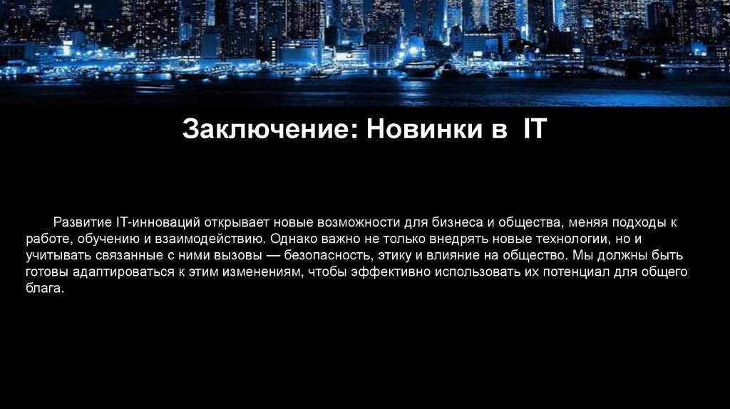 Заключение: Новинки в ITРазвитие IT-инноваций открывает новые возможности для бизнеса и общества, меняя подходы к