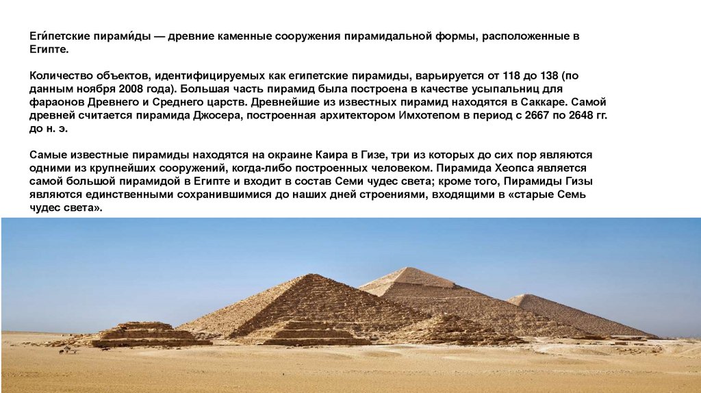 Еги́петские пирами́ды — древние каменные сооружения пирамидальной формы, расположенные вЕгипте.