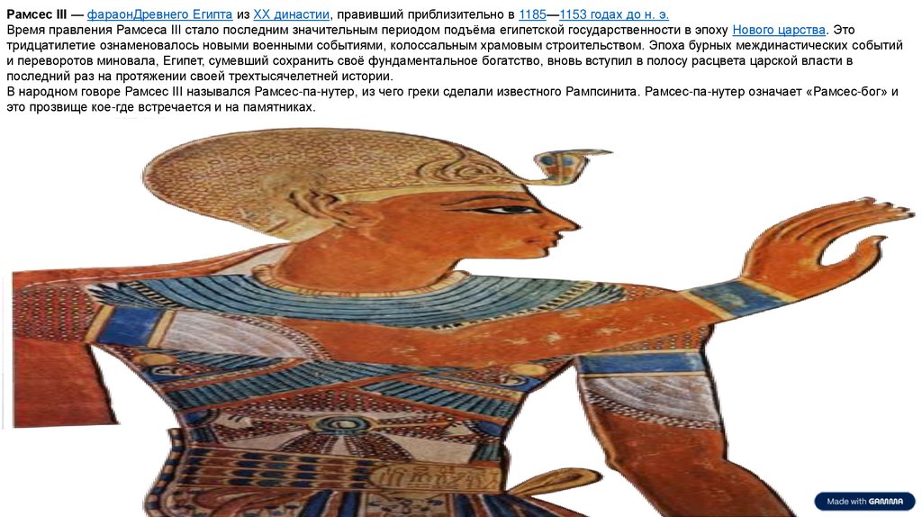 Рамсес III — фараонДревнего Египта из XX династии, правивший приблизительно в 1185—1153 годах до н. э.Время правления Рамсеса III стало последним значительным периодом подъёма египетской государственности в эпоху Нового царства. Это