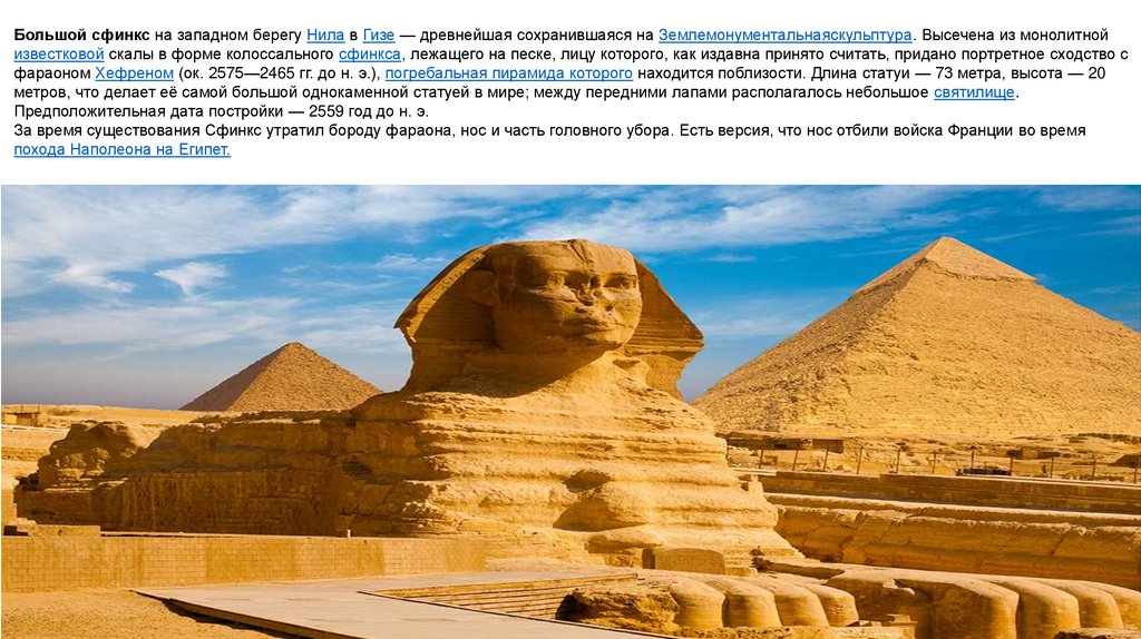 Большой сфинкс на западном берегу Нила в Гизе — древнейшая сохранившаяся на Землемонументальнаяскульптура. Высечена из монолитнойизвестковой скалы в форме колоссального сфинкса, лежащего на песке, лицу которого, как издавна принято считать, придано портретное сходство с