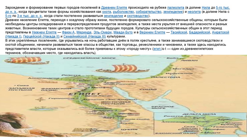 Зарождение и формирование первых городов-поселений в Древнем Египте происходило на рубеже палеолита (в долине Нила до 5-го тыс.до н. э., когда процветали такие формы хозяйствования как охота, рыболовство, собирательство, земледелие) и неолита (в долине Нила с