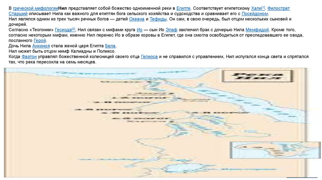 В греческой мифологииНил представляет собой божество одноименной реки в Египте. Соответствует египетскому Хапи[1]. ФилостратСтарший описывает Нила как важного для египтян бога сельского хозяйства и судоходства и сравнивает его с Посейдоном.
